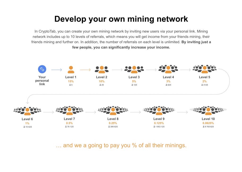 CryptoTab 設有推薦獎勵的機制,每個帳戶都會有Link ID,如果推介朋友使用CryptoTab的話,只要把這個 Link ID 轉送給他,系統便會自動替你把這個朋友計算在你的名下,而你也能從他採礦的分成。